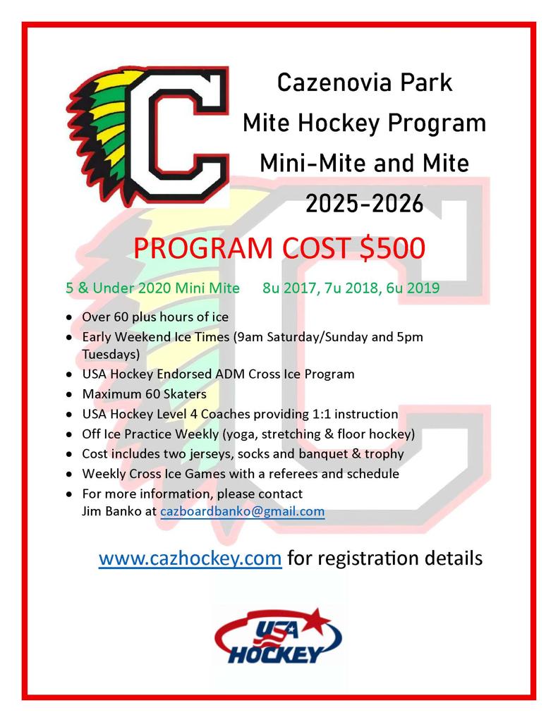 The Cazenovia Park Hockey Association is excited to announce registration for the 2025–2026 Mini-Mite and Mite Hockey Program. Open to players born in 2017, 2018, 2019, and younger (8U, 7U, 6U, and 5U Mini-Mites), the program provides young skaters with an outstanding opportunity to learn and grow in a fun, supportive environment.
